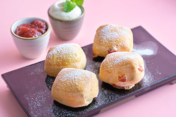 温かい状態で、いちごジャムとクリームを添えてご提供いたします。